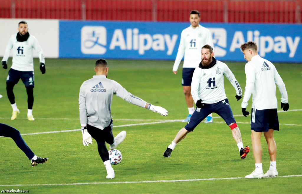 صورة التقطت أمس من الحصة التدريبية لمنتخب إسبانيا استعدادًا لمواجهة جورجيا اليوم ضمن تصفيات مونديال 2022 (الفرنسية)