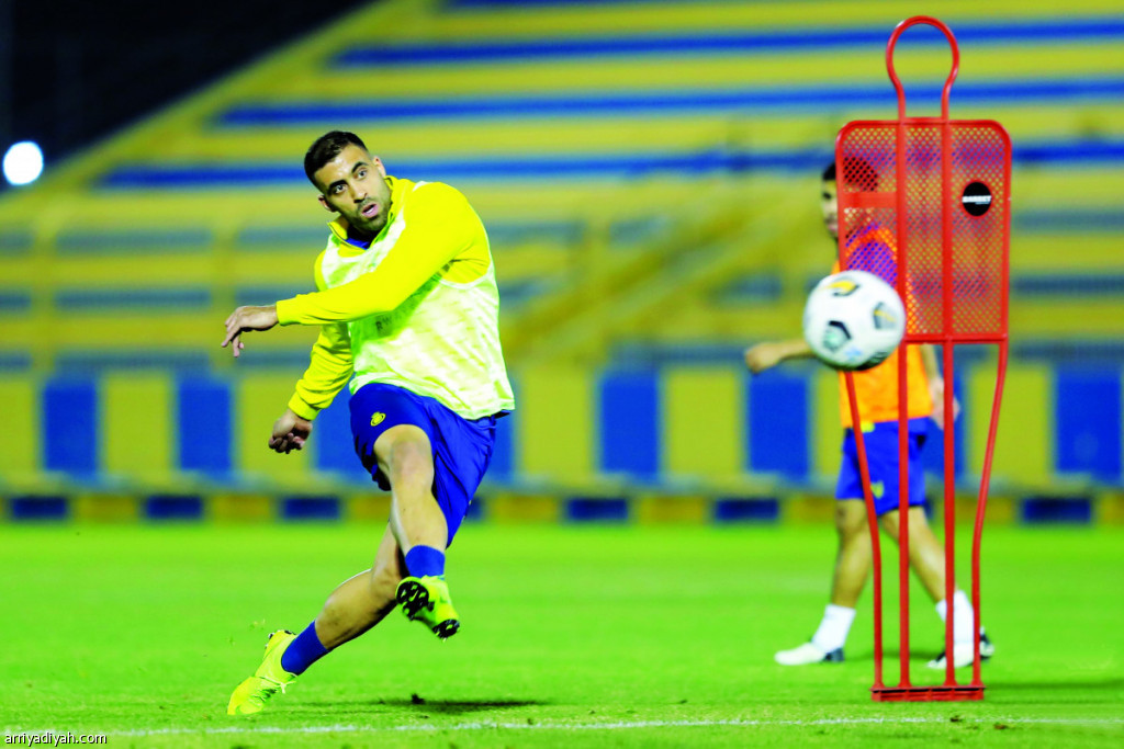 صورة التقطت أمس للمغربي عبد الرازاق حمد الله مهاجم فريق النصر الأول لكرة القدم خلال مشاركته في التدريبات التي فرضها الكرواتي هورفات مدرب الفريق على اللاعبين استعدادًا لمواجهة الفيصلي الأحد المقبل في نصف نهائي كأس خادم الحرمين الشريفين (المركز الإعلامي ـ النصر)
