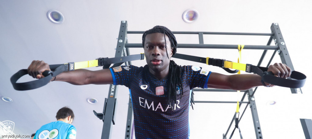 صورة التقطت أمس للفرنسي جوميز لاعب فريق الهلال الأول لكرة القدم يخضع لتمارين لياقية باستخدام أدوات تريكس خلال الحصة التي جرت في صالة الحديد في النادي (المركز الإعلامي ـ الهلال)