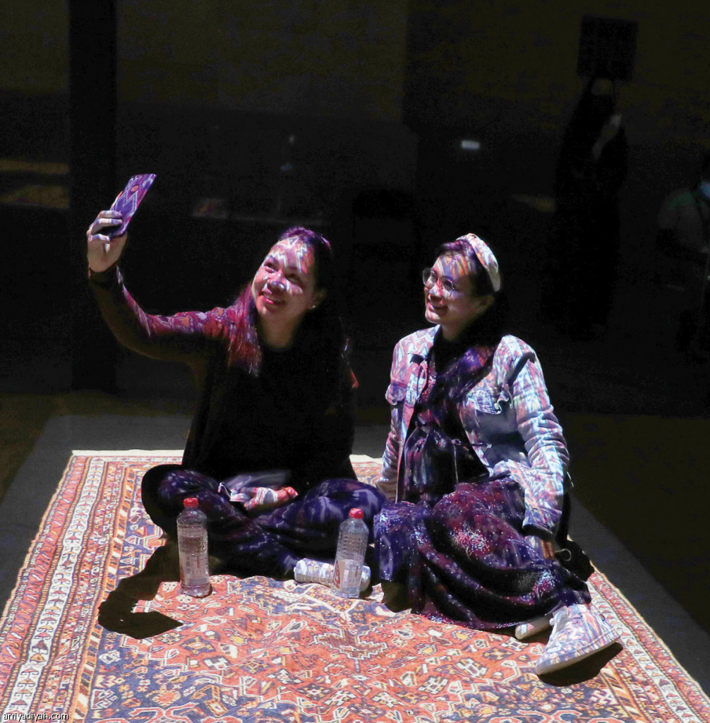 ويشهد العمل وجود عدد من الشباب السعوديين من الجنسين، إضافة إلى كبار السن، وعدد من الجاليات العربية والأجنبية، والذين يحرصون على التقاط الصور التذكارية أمام العمل والجلوس على البساط وملامسة الرمل ومحاكاة العمل الذي لاقى إعجاب الكثيرين.