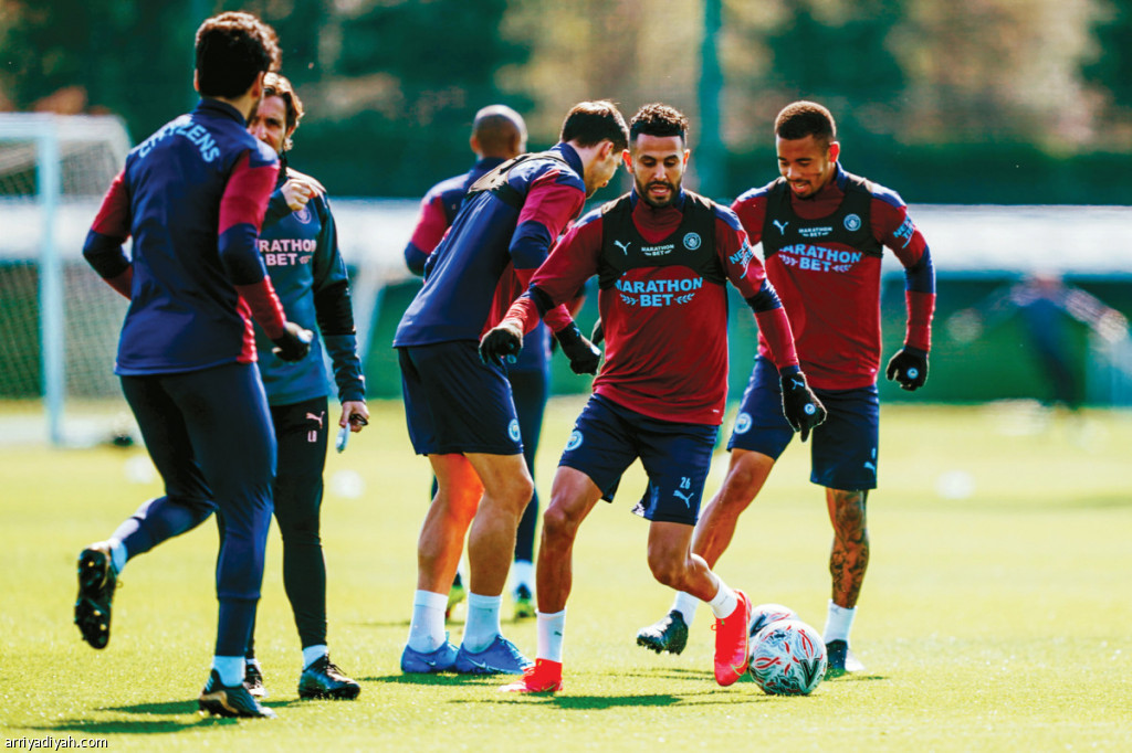 صورة التقطت أمس من الحصة التدريبية لفريق مانشستر سيتي استعدادًا لمواجهة تشيلسي ويظهر الجزائري رياض محرز والبرازيلي خيسوس(المركز الإعلامي - مانشستر سيتي)
