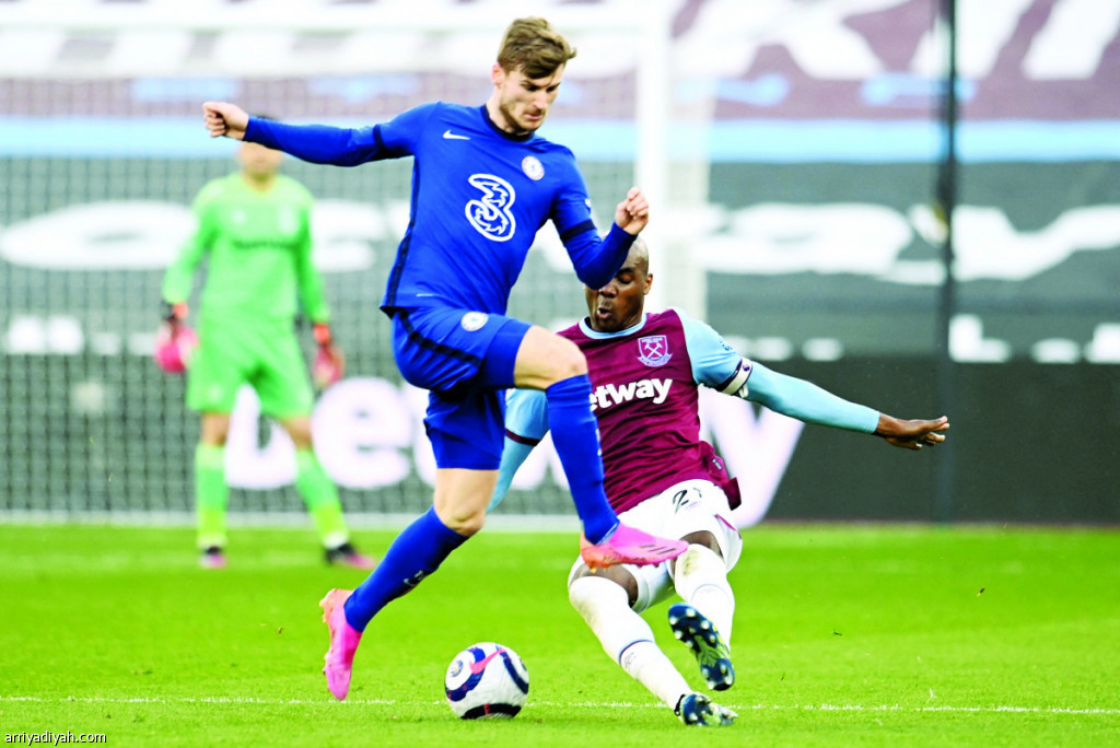 صورة التقطت أمس للألماني تيمو فيرنر مهاجم فريق تشيلسي أثناء محاولته المرور من الإيطالي أنجيلو أوجبونا مدافع وست هام يونايتد (الفرنسية)