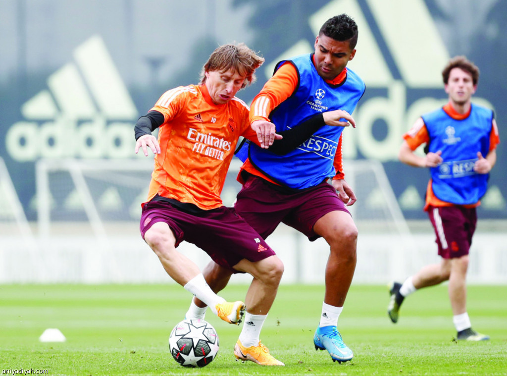 صورة التقطت أمس للوكا مودريتش وكارلوس إنريكي كاسيميرو لاعبي فريق ريال مدريد الإسباني أثناء التدريب الأخير للفريق قبل مواجهة تشيلسي الإنجليزي في نصف نهائي دوري أبطال أوروبا (الأوروبية)