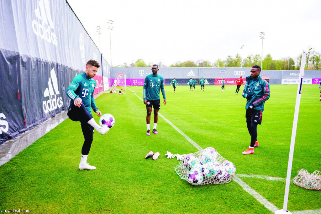 صورة التقطت أمس من تدريبات بايرن ميونيخ الألماني الذي يستعد لخوض ما تبقى من منافسات في الدوري المحلي (المركز الإعلامي - ميونيخ)
