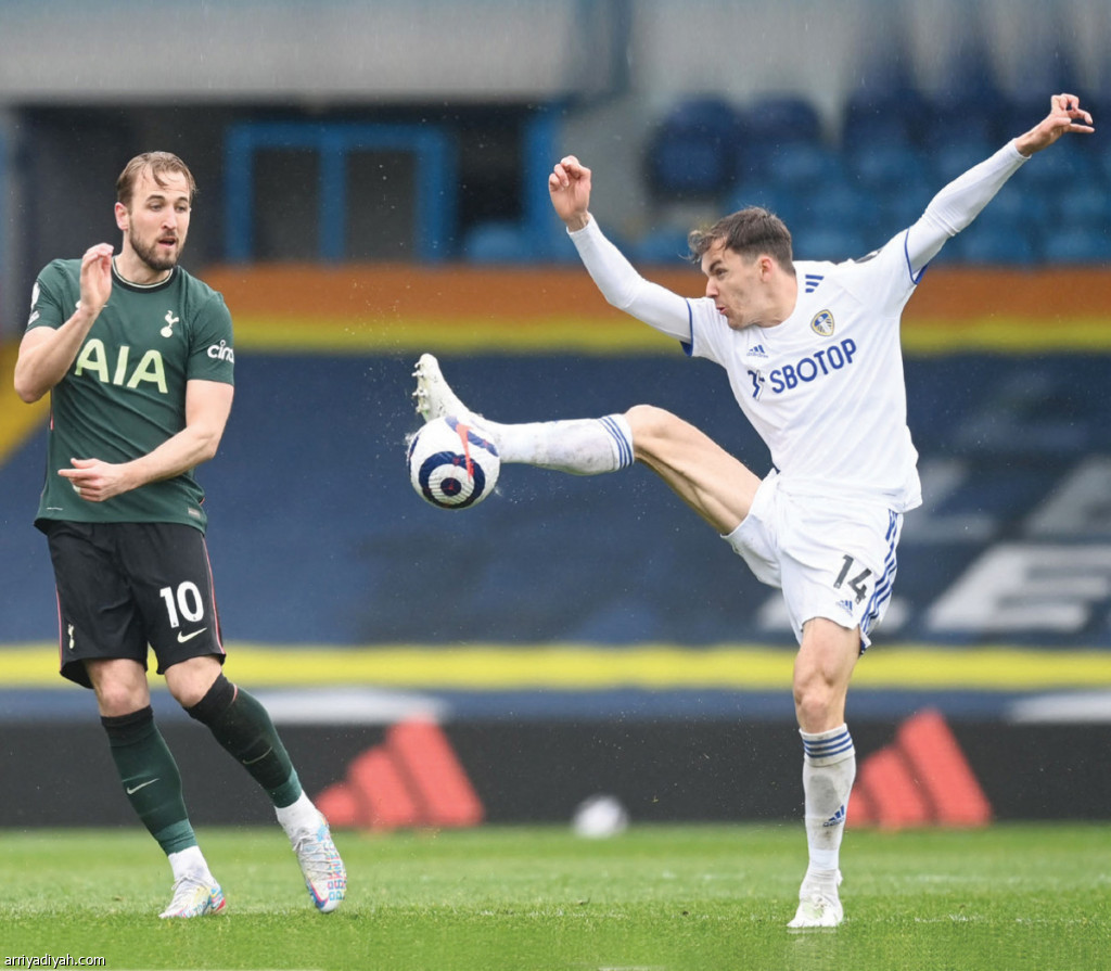 صورة التقطت أمس للإسباني دييجو ليورنتي مدافع ليدز يحاول السيطرة على الكرة من أمام الإنجليزي هاري كين مهاجم توتنهام خلال مباراة الفريقين أمس (الفرنسية)