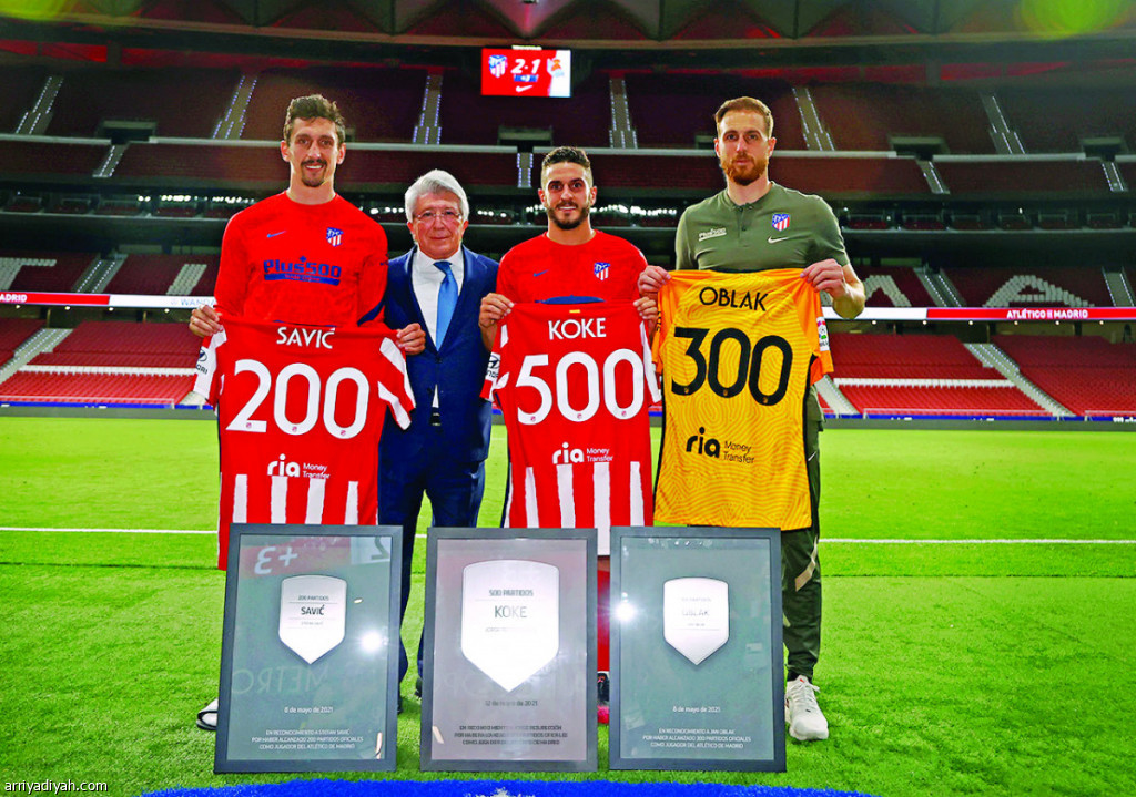 كرّم نادي أتلتيكو مدريد الإسباني أمس الأول الإسباني كوكي لاعب الوسط وقائد الفريق الأول لكرة القدم وزميليه السلوفيني يان أوبلاك حارس المرمى والمونتينيجري ستيفان سافيتش قلب الدفاع بمناسبة بلوغهم 500 و300 و200 مباراة على التوالي وذلك عقب مباراة ريال سوسيداد