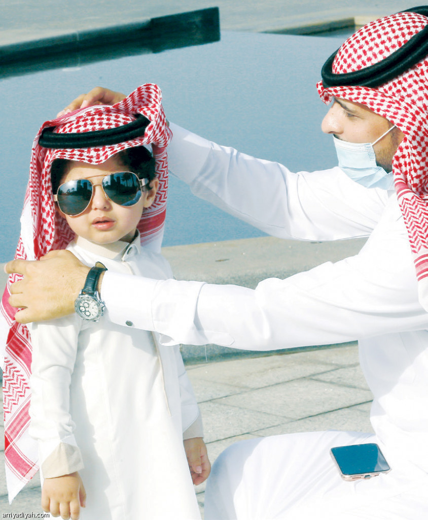 يحرص سعوديون في عيد الفطر على ارتداء صغارهم الثوب والشماغ والغترة بدءًا من صلاة العيد وطوال مناسباته.. وفي الصورة التي التقطت أمس الأول يضبط سعودي في جدة الشماغ على رأس طفله (أسوشيتد برس)