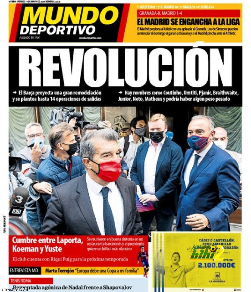 وأبرزت الصحيفة على غلافها أمس صورة خوان لابورتا رئيس النادي والهولندي رونالد كومان المدرب وماتيو أليماني المدير الرياضي بعد خروجهم من اجتماع لبحث أسباب تراجع الفريق أخيرًا، وأبرزت عددًا من أسماء قائمة الراحلين، ومنهم البرازيليون فيليب كوتينيو، ونيتو حارس المرمى، وماتيوس فرنانديز، والفرنسي صامويل أومتيتي، والإسباني فيربو جونيور، والبوسني ميراليم بيانيتش والدنماركي مارتن برايثوايت. ومن المواضيع المطروحة أيضًا رحيل أحد اللاعبين الكبار، أبرزهم سيرجي روبيرتو، الذي