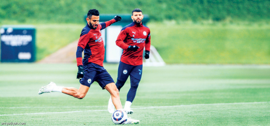 في الصورة التي التقطت أمس يظهر أجويرو يراقب تسديدة الجزائري رياض محرز المهاجم خلال التدريبات الاستعدادية للمباراة الختامية في الدوري أمام إيفرتون غدًا (المركز الإعلامي - السيتي)