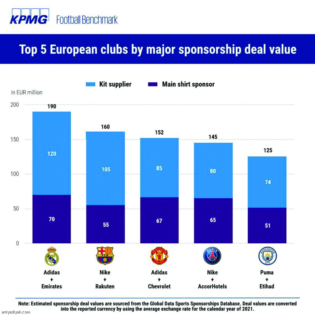 جاء ناديان إسبانيان وإنجليزيان وفرنسي ضمن أكثر الأندية الأوروبية عائدات مالية من الشركة الراعية للقميص “كراع رئيس”، والشركة المصنعة للأطقم، حيث احتل نادي ريال مدريد الإسباني قائمة أعلى الأندية دخلًا بواقع 190 مليون يورو، منها 120 مليونًا من شركة أديداس المصنِّعة لأطقم الفريق، و70 مليونًا من شركة طيران الإمارات.