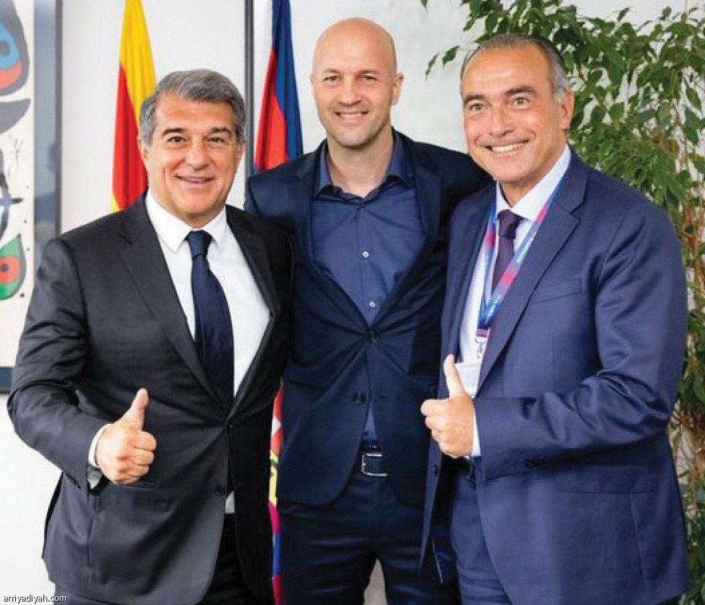 صورة التقطت أمس لكرويف يتوسط لابورتا رئيس النادي وأليماني المدير الرياضي بعد الاتفاق(المركز الإعلامي - برشلونة)