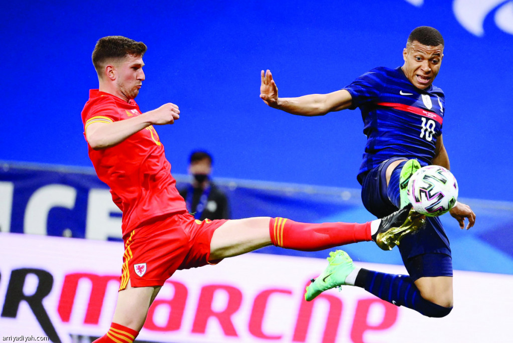 صورة التقطت الأربعاء الماضي لمبابي مهاجم المنتخب الفرنسي في صراع على الكرة مع كريس ميفام مدافع المنتخب الويلزي خلال المباراة التجريبية بينهما (الفرنسية)