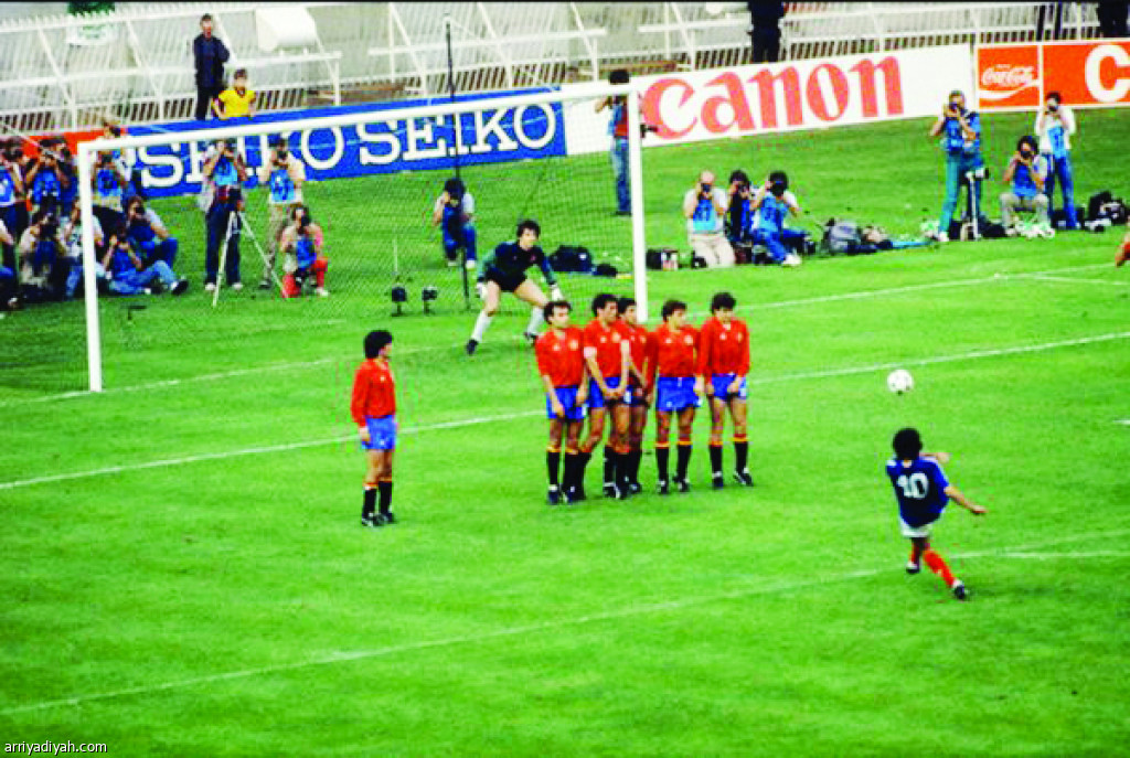 صورة التقطت في 27 يونيو 1984 لميشيل بلاتيني لحظة إحراز الهدف الأول لمنتخب فرنسا في نهائي كأس أوروبا على المنتخب الإسباني في ملعب “حديقة الأمراء” في باريس (أرشيفية)