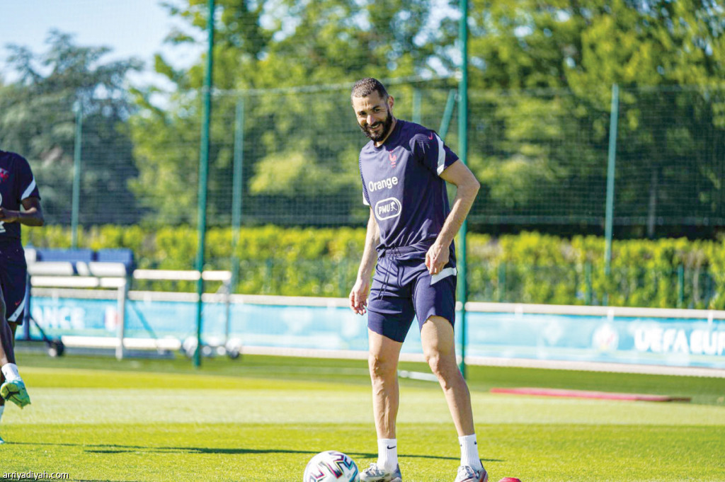 صورة التقطت أمس لكريم بنزيمة لاعب منتخب فرنسا الأول لكرة القدم أثناء التدريبات استعدادًا لمواجهة ألمانيا غدًا ضمن منافسات يورو 2020 (المركز الإعلامي ـ منتخب فرنسا)