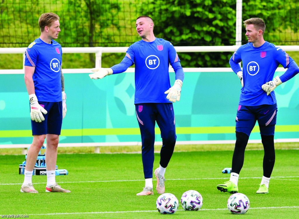 صورة التقطت في 10 يونيو الجاري لهندرسون وسام جونستون وجوردان بيكفورد حراس مرمى المنتخب الإنجليزي الأول لكرة القدم في حصة تدريبية(الفرنسية)