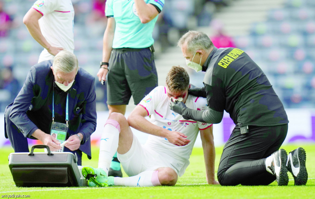 صورة التقطت أمس للتشيكي باتريك تشيك يتلقى الإسعافات الأولية بعد إصابته أمام كرواتيا (رويترز)