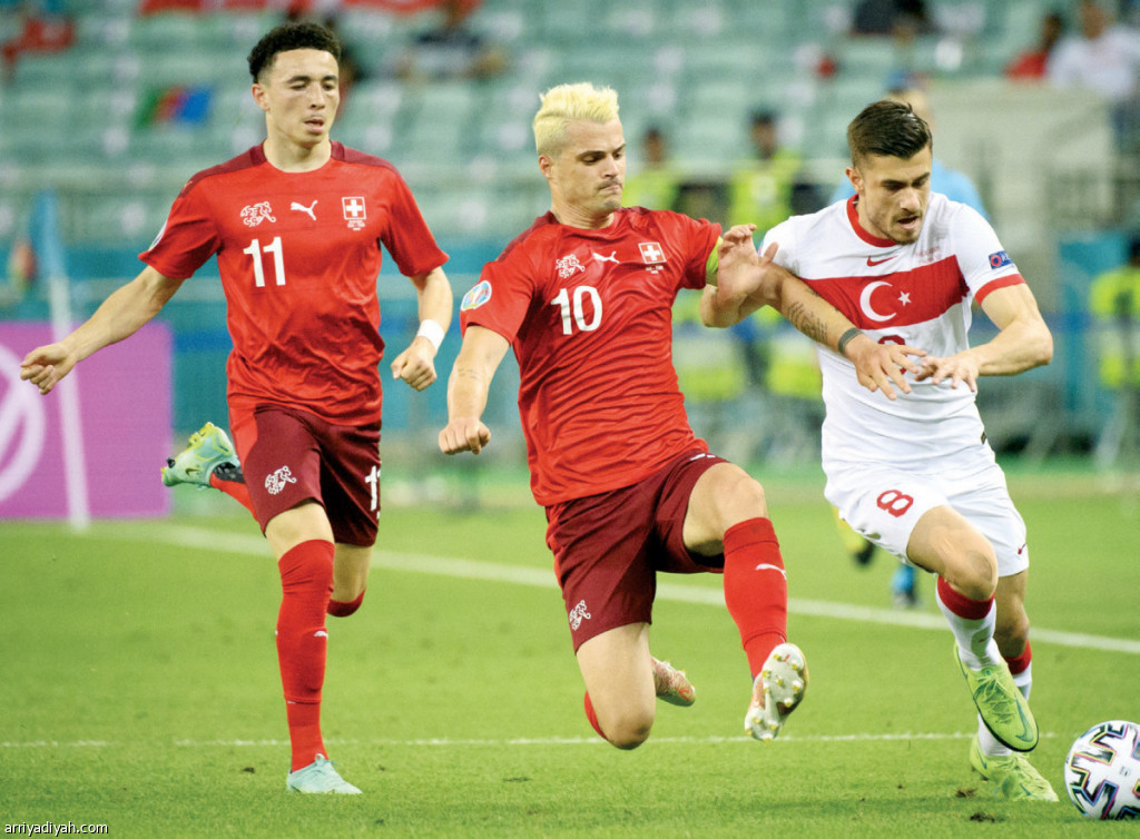 صورة التقطت أمس لدوروخان توكوز لاعب منتخب تركيا يحاول الانطلاق بالكرة وسط مطاردة الثنائي فارجاس وشاكا لاعبي سويسرا(الأوروبية)