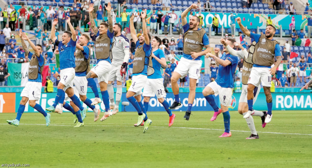 صورة التقطت أمس للاعبي منتخب إيطاليا يحتفلون بالفوز على ويلز بهدف دون مقابل على أرضية ملعب الأولمبيكو في روما في ختام منافسات المجموعة الأولى من بطولة أمم أوروبا(أسوشيتد برس)