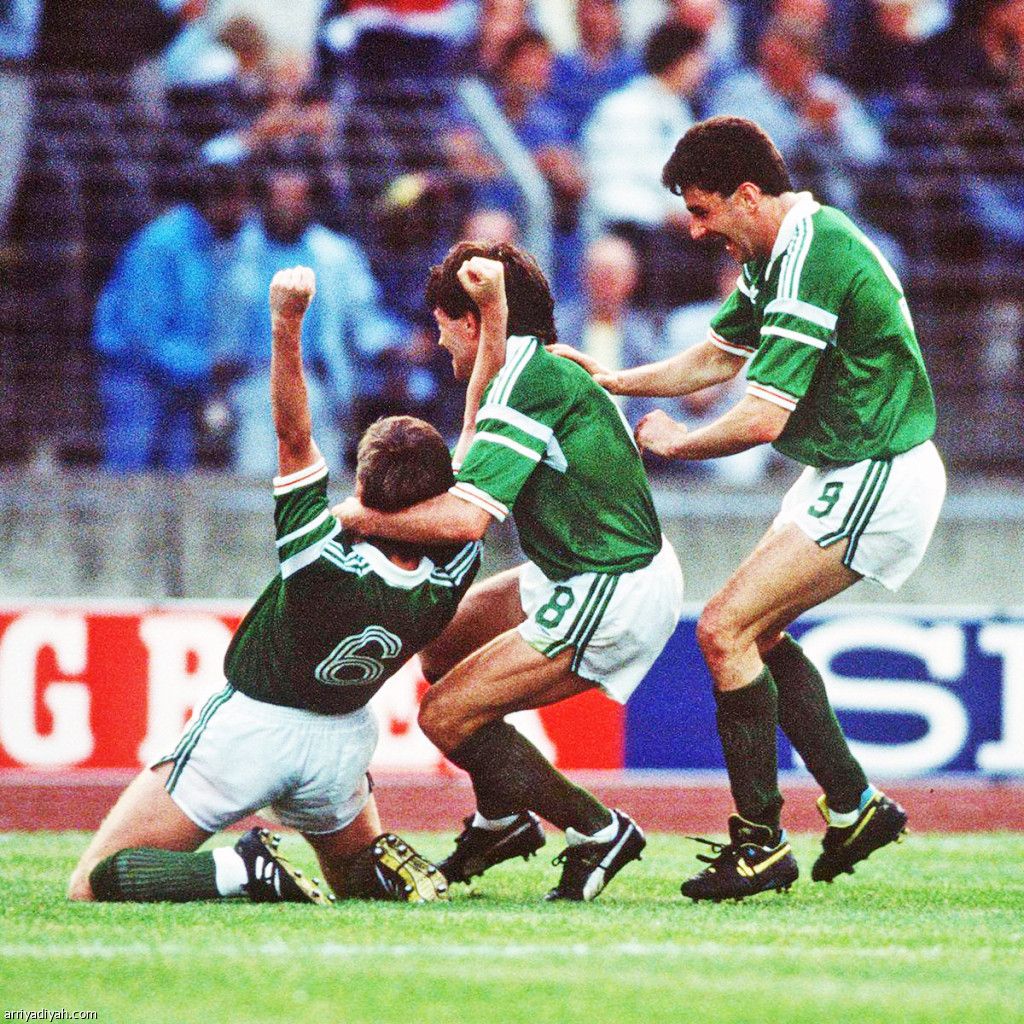 صورة التقطت لويلان، لاعب وسط منتخب إيرلندا، يحتفل بهدفه في روسيا خلال يورو 1988 برفقة راي هوتون وجون ألدريدج، زميليه(أرشيفية)