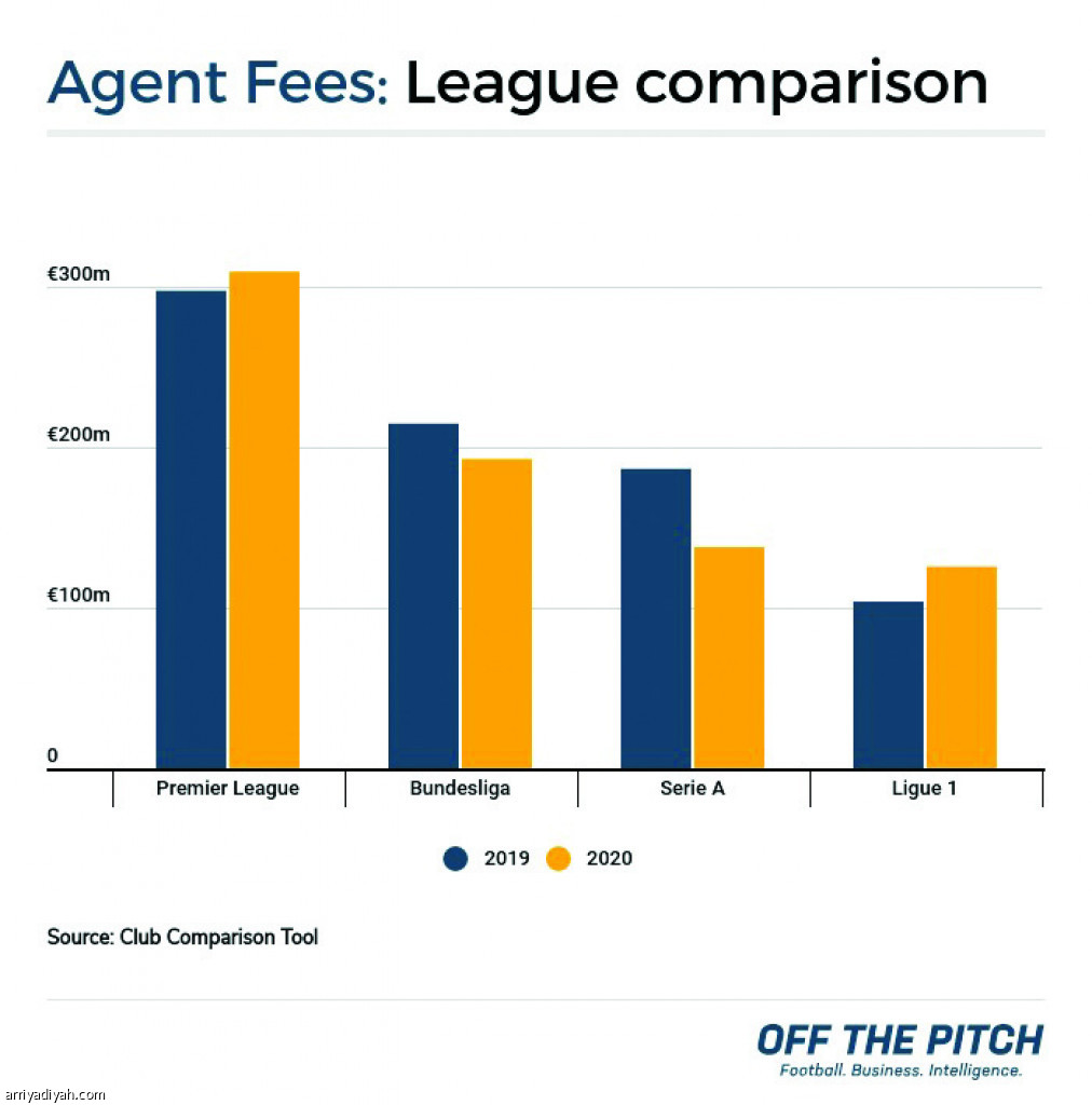 حيث بقي متصدرًا على مستوى العالم بأكثر من 300 مليون يورو في 2019، وعلى الرغم من جائحة كورونا التي لم تؤثر على عمولات اللاعبين، حيث شهدت ارتفاعًا بنحو 310 ملايين يورو في العام الماضي، في حين جاء الدوري الألماني ثانيًا بقيمة تجاوزت 200 مليون يورو في 2019، إلا أن عمولات اللاعبين انخفضت لأقل من هذه المبالغ في عام 2020، إلى نحو 180 مليون يورو.
