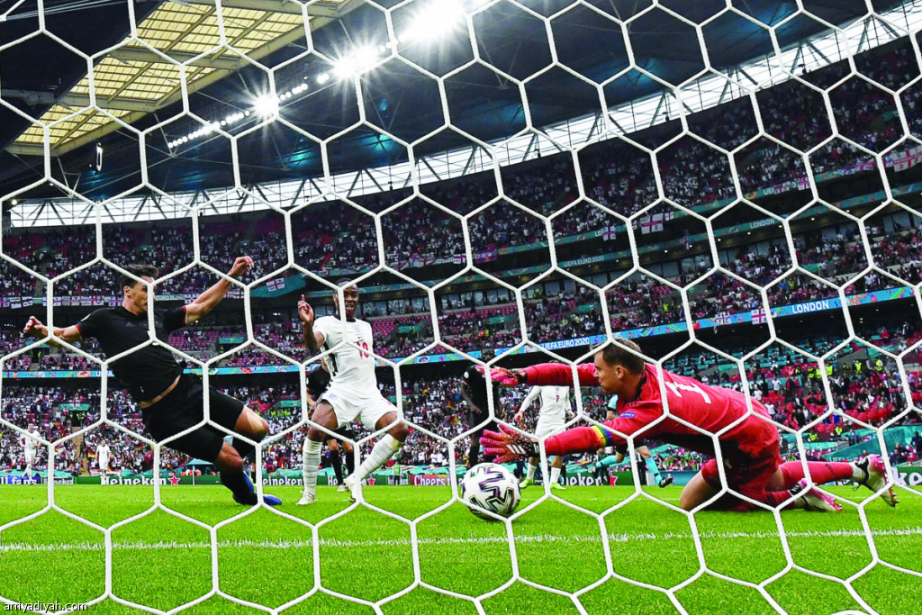 صورة التقطت أمس لرحيم ستيرلينج بعد تسديده الكرة على مرمى المنتخب الألماني مسجلًا الهدف الأول لإنجلترا.. ويظهر نوير وهوملز يحاولان التصدي لها دون فائدة (الفرنسية)