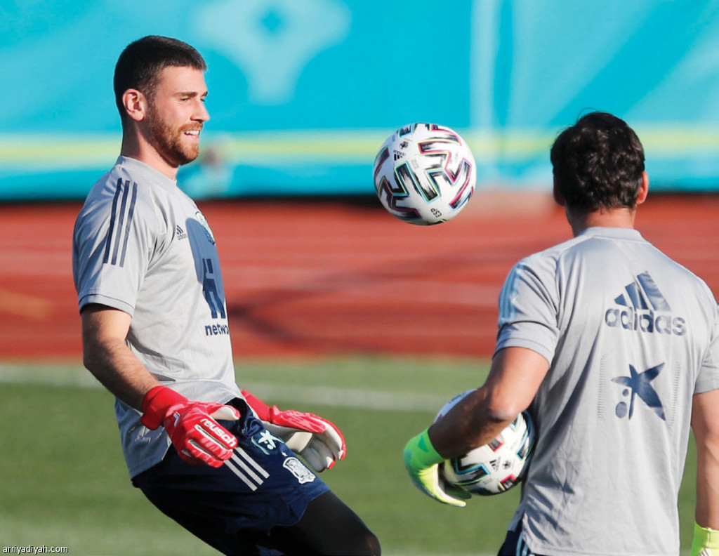 صورة التقطت أمس لأوناي سيمون، حارس مرمى المنتخب الإسباني، يتدرب استعدادًا لمواجهة سويسرا غدًا(رويترز)