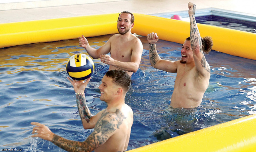 صورة التقطت أمس لهاري كين وكيران تريبير وكالفن فيليبس لاعبي المنتخب الإنجليزي في حصة تدريبية ترفيهية داخل حوض السباحة (المركز الإعلامي- المنتخب الإنجليزي)