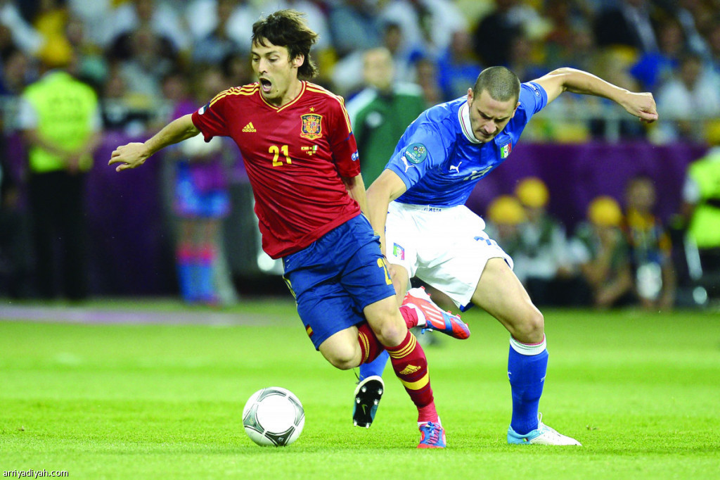 صورة التقطت من نهائي “يورو 2012” ويظهر ليوناردو بونوتشي لاعب منتخب إيطاليا يحاول قطع الكرة من ديفيد سيلفا لاعب إسبانيا (الفرنسية)