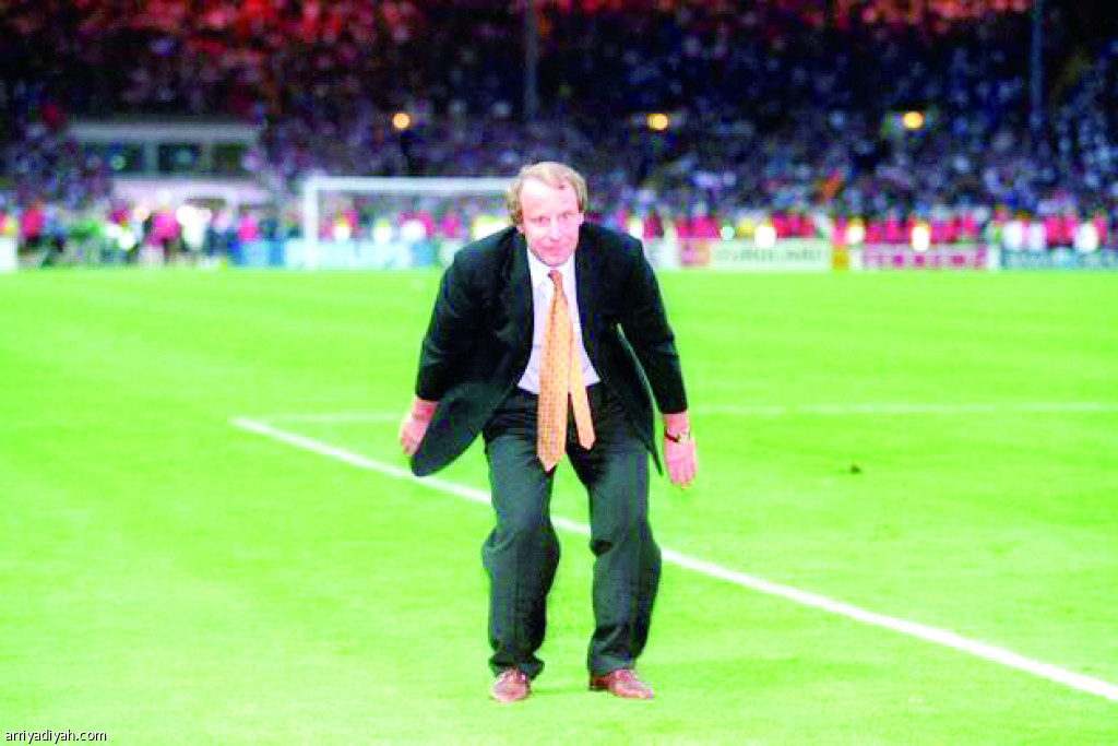 صورة التقطت في 30 يونيو 1996 للألماني بيرتي فوجتس، مدرب منتخب بلاده سابقًا، يحتفل مع المشجعين في ملعب ويمبلي في إنجلترا بحصد لقب كأس أوروبا “يورو 1996” (أرشيفية)