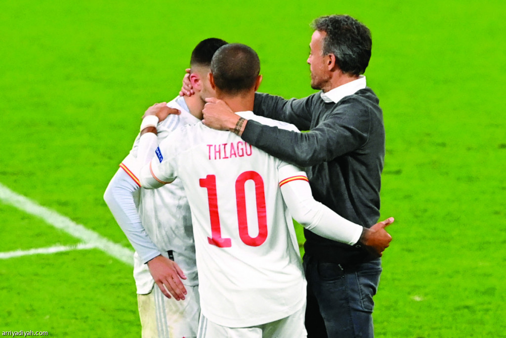 صورة التقطت أمس الأول للويس إنريكي مدرب منتخب إسبانيا يواسي لاعبيه بعد نهاية مباراة إيطاليا(الفرنسية)