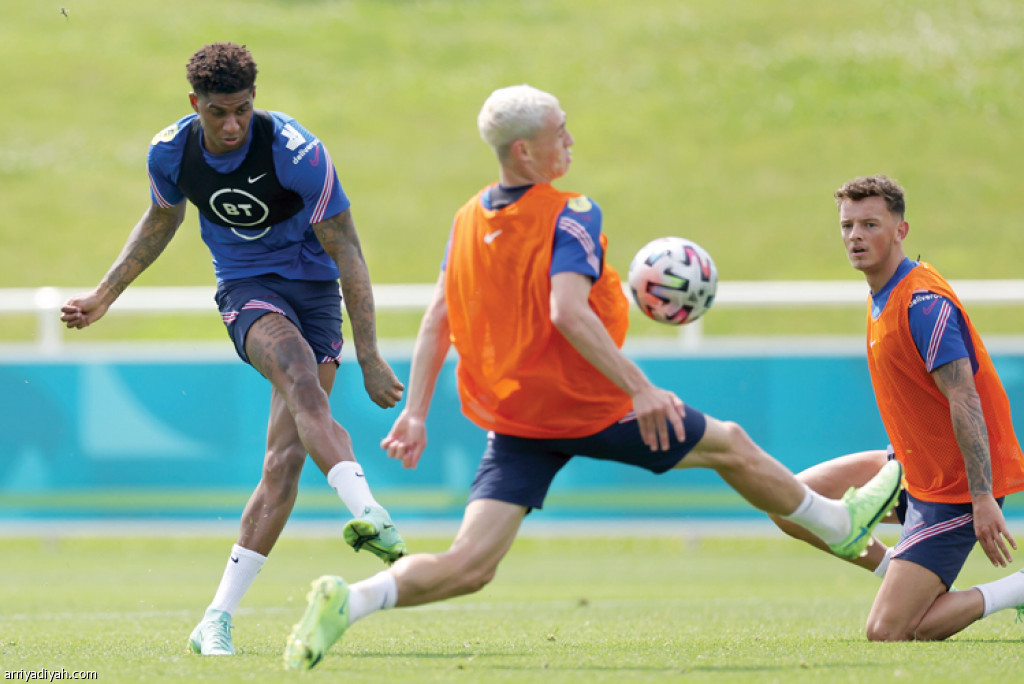 صورة التقطت أمس الأول لفودين لاعب منتخب إنجلترا يحاول اعتراض تسديدة زميله راشفورد خلال التدريبات (المركز الإعلامي ـ منتخب إنجلترا)