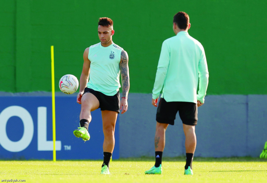 صورة التقطت أمس للاوتارو مارتينيز، مهاجم المنتخب الأرجنتيني، يستعرض بالكرة في التدريبات(أسوشيتد برس)
