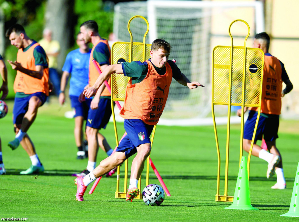 صورة التقطت أمس لنيكولو باريلا، لاعب وسط المنتخب الإيطالي، يمر بالكرة بين أقماع في التدريب قبل الأخير استعدادًا لنهائي يورو 2020 غدًا أمام إنجلترا (المركز الإعلامي ـ المنتخب الإيطالي)