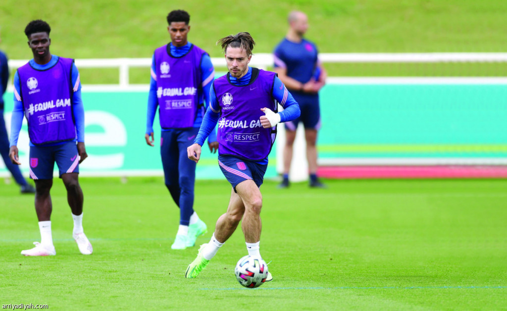 صورة التقطت أمس لجاك جريليش لاعب منتخب إنجلترا الأول لكرة القدم يستعد للانطلاق بالكرة خلال التدريبات تحضيرًا للقاء إيطاليا اليوم على ملعب ويمبلي في لندن في نهائي بطولة أمم أوروبا (رويترز)