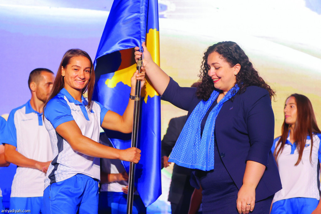 تشارك كوسوفو في دورة الألعاب الأولمبية للمرة الثانية في تاريخها.. صورة التقطت أمس فيوسا عثماني رئيس كوسوفو تُسلِّم علم الدولة إلى رئيس البعثة المشاركة في “طوكيو 2020”