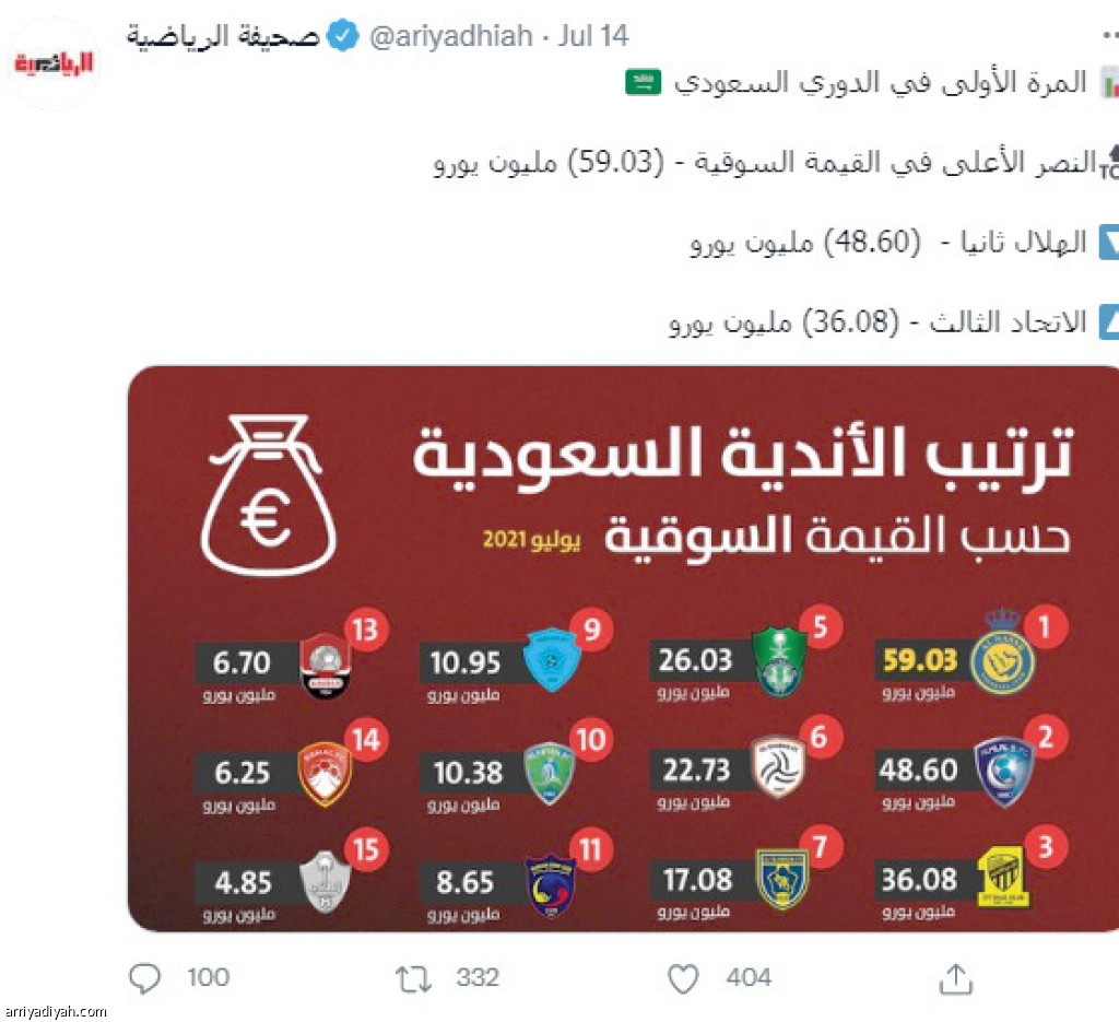 فتح إنفوجرافيكس القيمة السوقية للأندية السعودية، الذي نشرته “الرياضية” على حسابها في تويتر، باب المناكفات بين مشجعي الهلال والنصر.