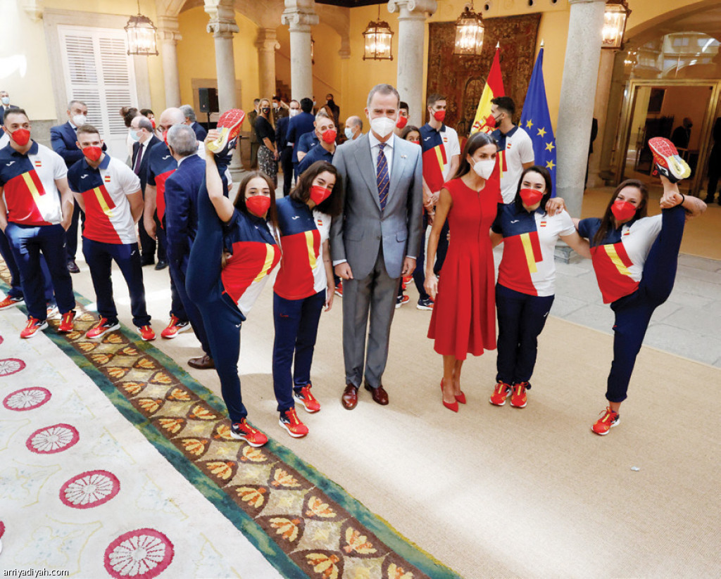 حظيت البعثة الإسبانية المشاركة في أولمبياد طوكيو بوداع حافل من قِبل فيليب السادس ملك إسبانيا.. وفي الصورة التي التقطت أمس الملك الإسباني خلال استقباله الرياضيين في قصر مونكلوا في مدريد