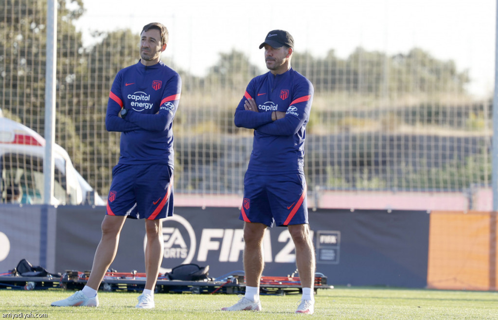صورة التقطت أمس للأرجنتيني دييجو سيميوني مدرب فريق أتلتيكو مدريد خلال التدريبات برفقة مساعده (المركز الإعلامي - أتلتيكو مدريد)
