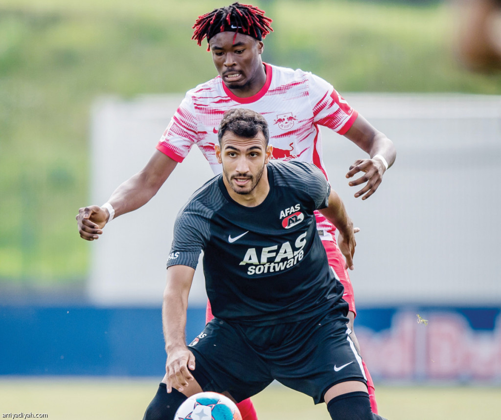 صورة التقطت أمس لكريستوفر نكونكو لاعب فريق لايبزج يحاول قطع الكرة من منافسه لاعب ألكمار الهولندي (المركز الإعلامي - لايبزج)