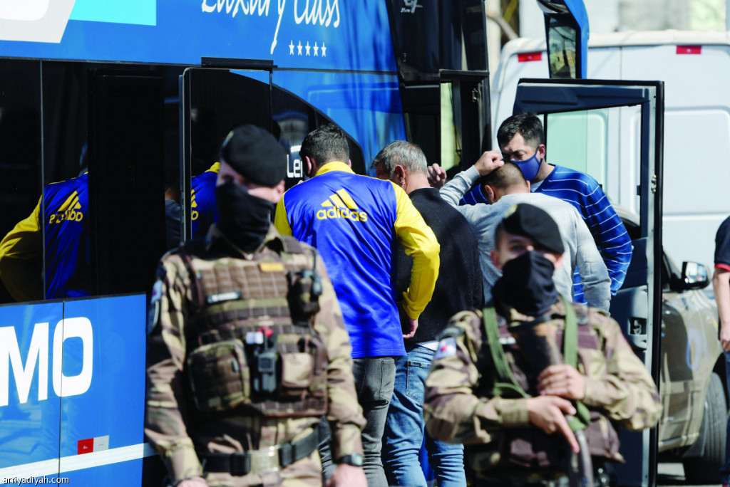 صورة التقطت أمس لأعضاء من فريق بوكا جونيورز يغادرون مركزًا للشرطة في مدينة بيلو هوريزونتي البرازيلية بعدما أوقفوا على خلفية أحداث المباراة مع أتلتيكو مينيرو (رويترز)