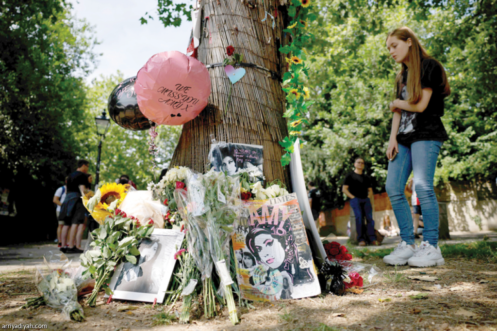 تجمع محبون للبريطانية إيمي واينهاوس، المغنية وكاتبة الأغاني، قرب منزلها السابق شمالي لندن العاصمة إحياءً للذكرى العاشرة لوفاتها المفاجئة عن عمر 27 عامًا.. وفي الصورة تقف فتاة أمام صور لواينهاوس وضعها محبوها تزامنًا مع الذكرى