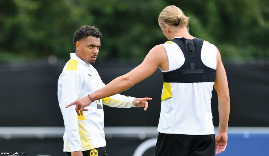 صورة التقطت أمس لمالين لاعب دورتموند يتحدث مع هالاند زميله خلال التدريبات (المركز الإعلامي - دورتموند)