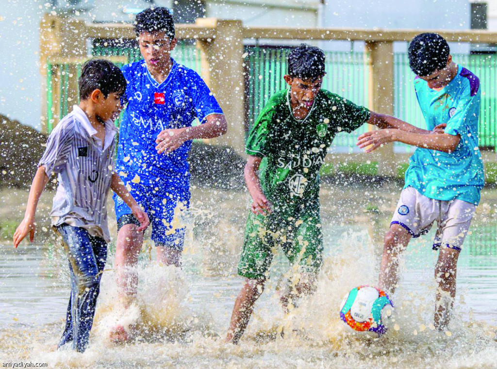 يفضّل صبية في قرية العالية التابعة لمنطقة جازان الخروج أثناء هطول الأمطار للهو ولعب كرة القدم مستفيدين من الانخفاض المؤقت لدرجات الحرارة الصيفية.. صورة التقطت أمس الأول يلعب أربعة صبية كرة القدم أمام مصلى العيد في القرية وسط مياه خلفها هطول الأمطار