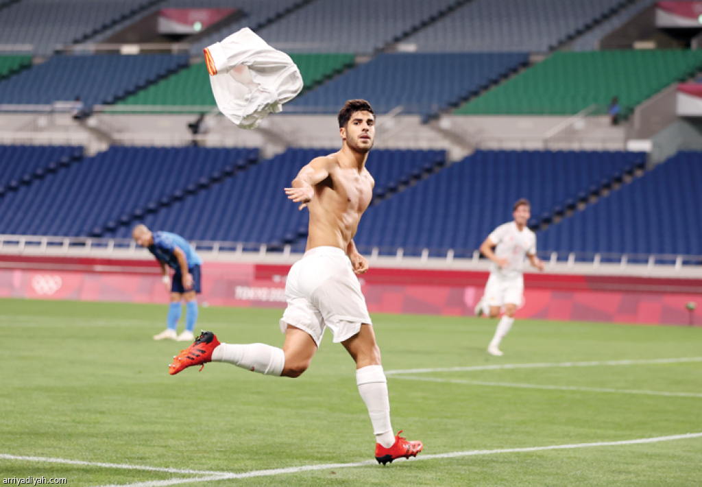 صورة التقطت أمس لماركو أسينسيو لاعب المنتخب الأولمبي الإسباني يرمي قميصه احتفالًا بتسجيله هدف الفوز في مرمى اليابان (رويترز)