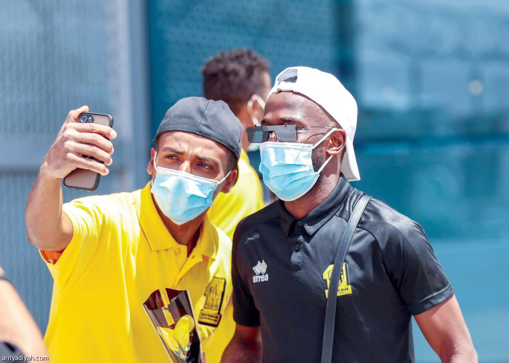صورة التقطت أمس لفهد المولد، مهاجم فريق الاتحاد الأول لكرة القدم، يستجيب لطلب مشجع بأخذ سيلفي معه لدى الوصول إلى الرياض تأهبًا لمواجهة الفيحاء اليوم على ملعب المجمعة في افتتاح دوري كأس محمد بن سلمان للمحترفين (المركز الإعلامي ـ الاتحاد)