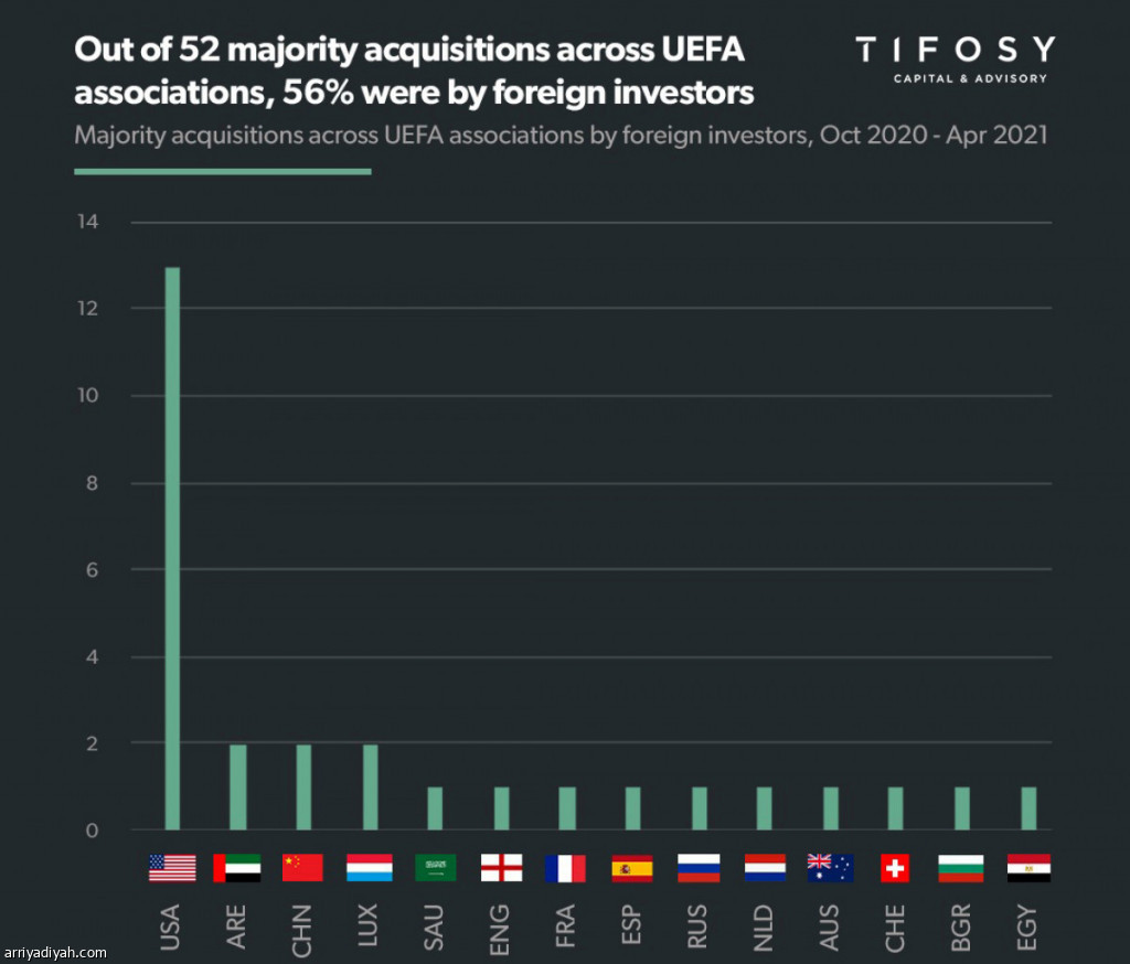 بلغت نسبة الملاك الأجانب في الأندية الأوروبية في العام الماضي 2020 نحو 56 في المئة.