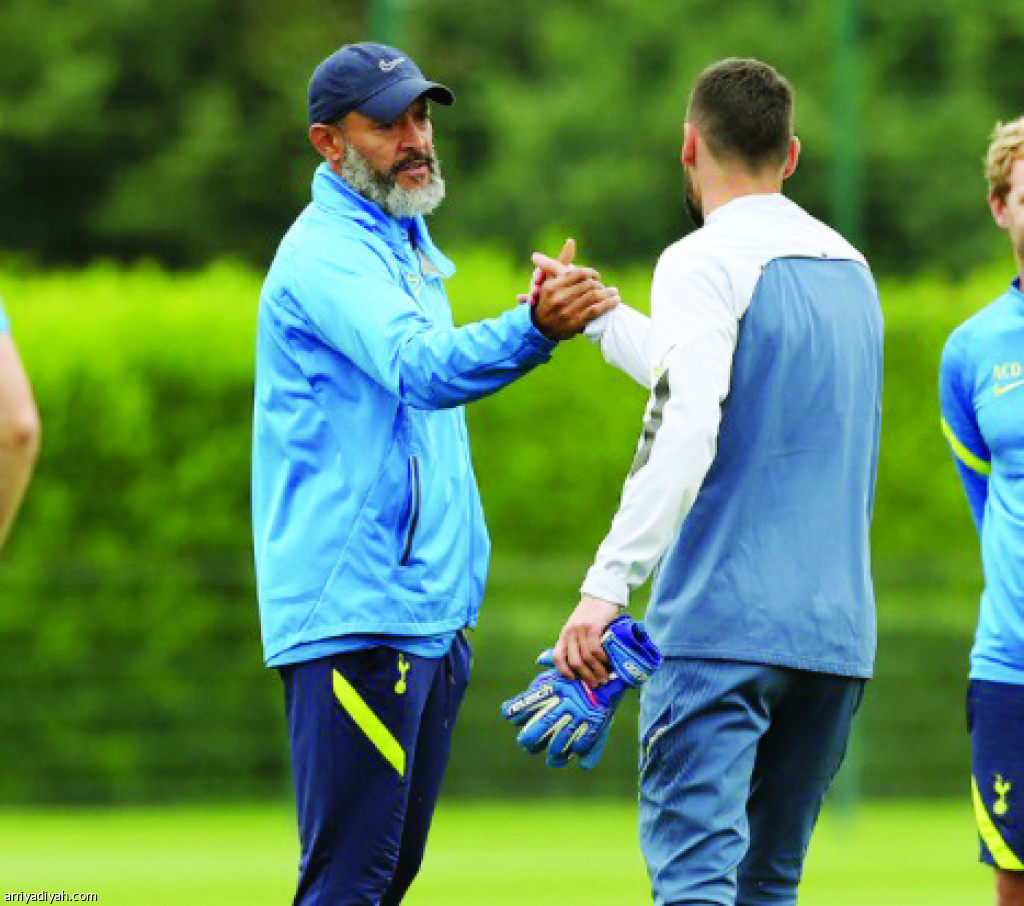 صورة التقطت أمس لسانتوس يصاقح هوجو لوريس قبل انطلاق الحصة التدريبيبة (المركز الإعلامي ـ توتنهام)