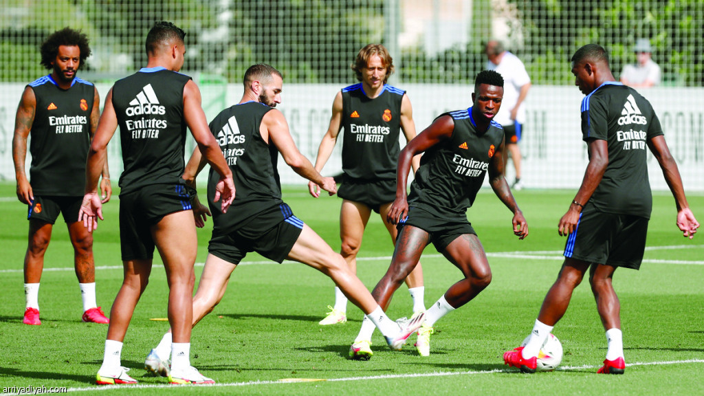 صورة التقطت أمس لديفيد ألابا يمرر الكرة وسط متابعة من كريم بنزيمة والبرازيليين فينيسيوس جونيور (المركز الإعلامي ـ ريال مدريد)