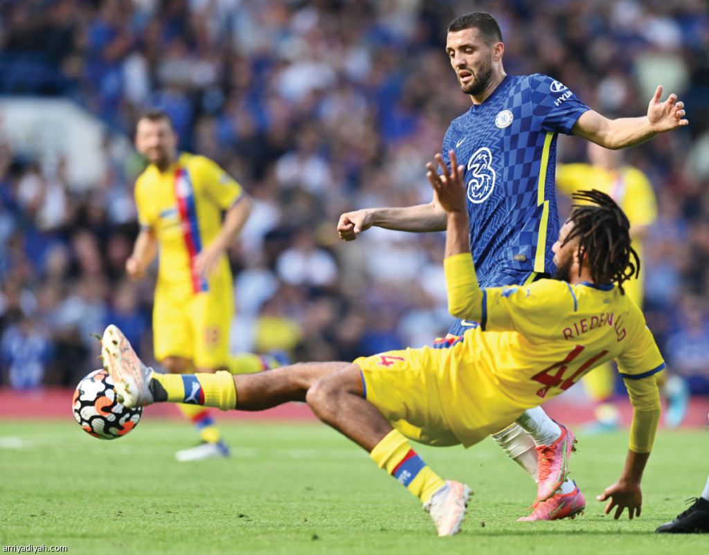 صورة التقطت للكرواتي ماتيو كوفاتيتش لاعب وسط فريق تشيلسي في صراع على الكرة مع الهولندي جايرو ريدوالد مدافع كريستال بلاس خلال مواجهة الفريقين لحساب الجولة الأولى من الدوري الإنجليزي (الفرنسية)