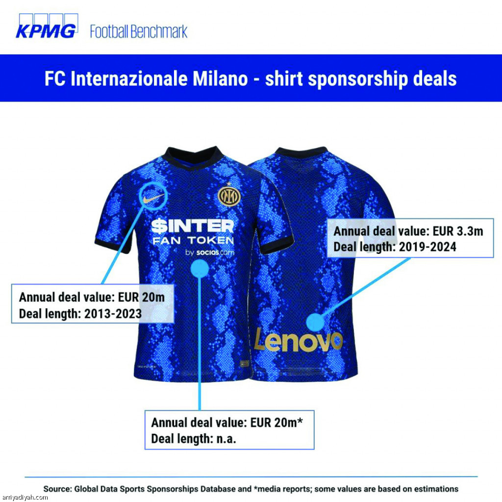 أبرم نادي إنتر ميلان الإيطالي عدة عقود استثمارية لقميص فريقه الأول لكرة القدم بدءًا من الموسم الجاري، وسيجني بطل الدوري الإيطالي الموسم الماضي، أكثر من 43 مليون يورو من رعايات قميصه فقط، المتمثلة برعاة منطقتي الصدر والظهر .